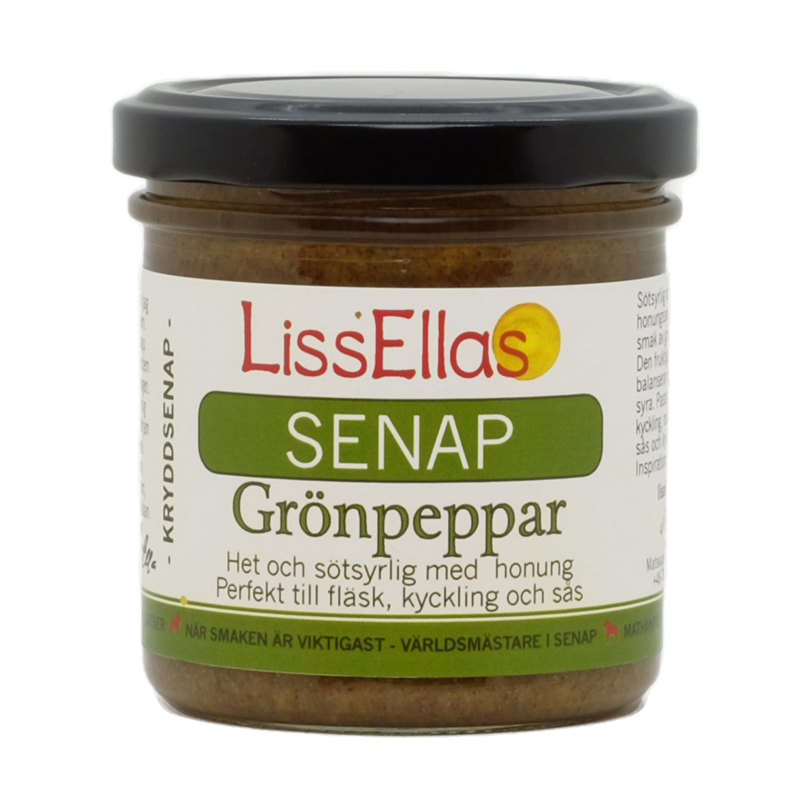 En sötsyrlig honungssenap med tydlig grönpepparsmak. Halvgrov senap. Senapen passar bra till gärna lite feta korvar, fläskkött men även kyckling och stekt panerad fisk.