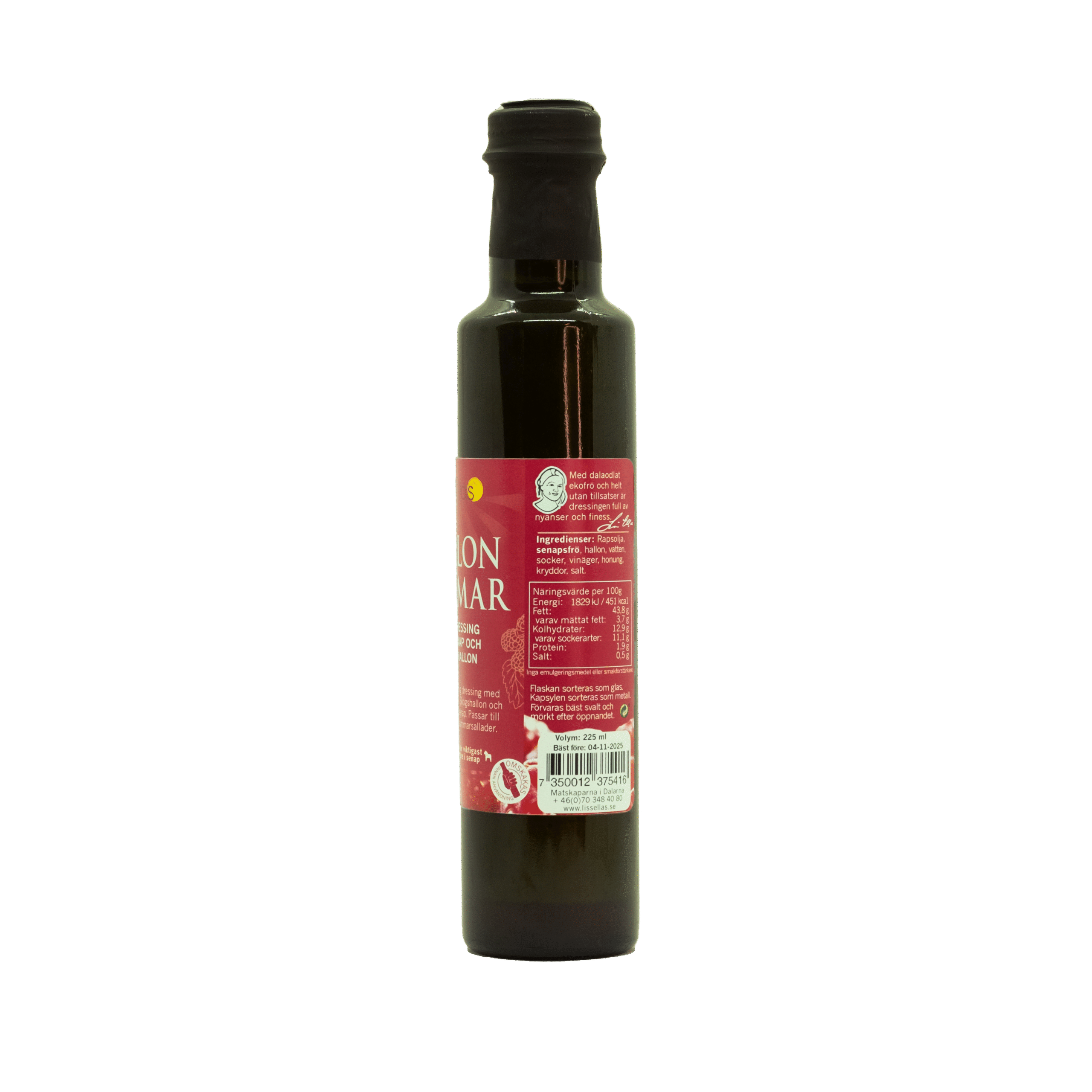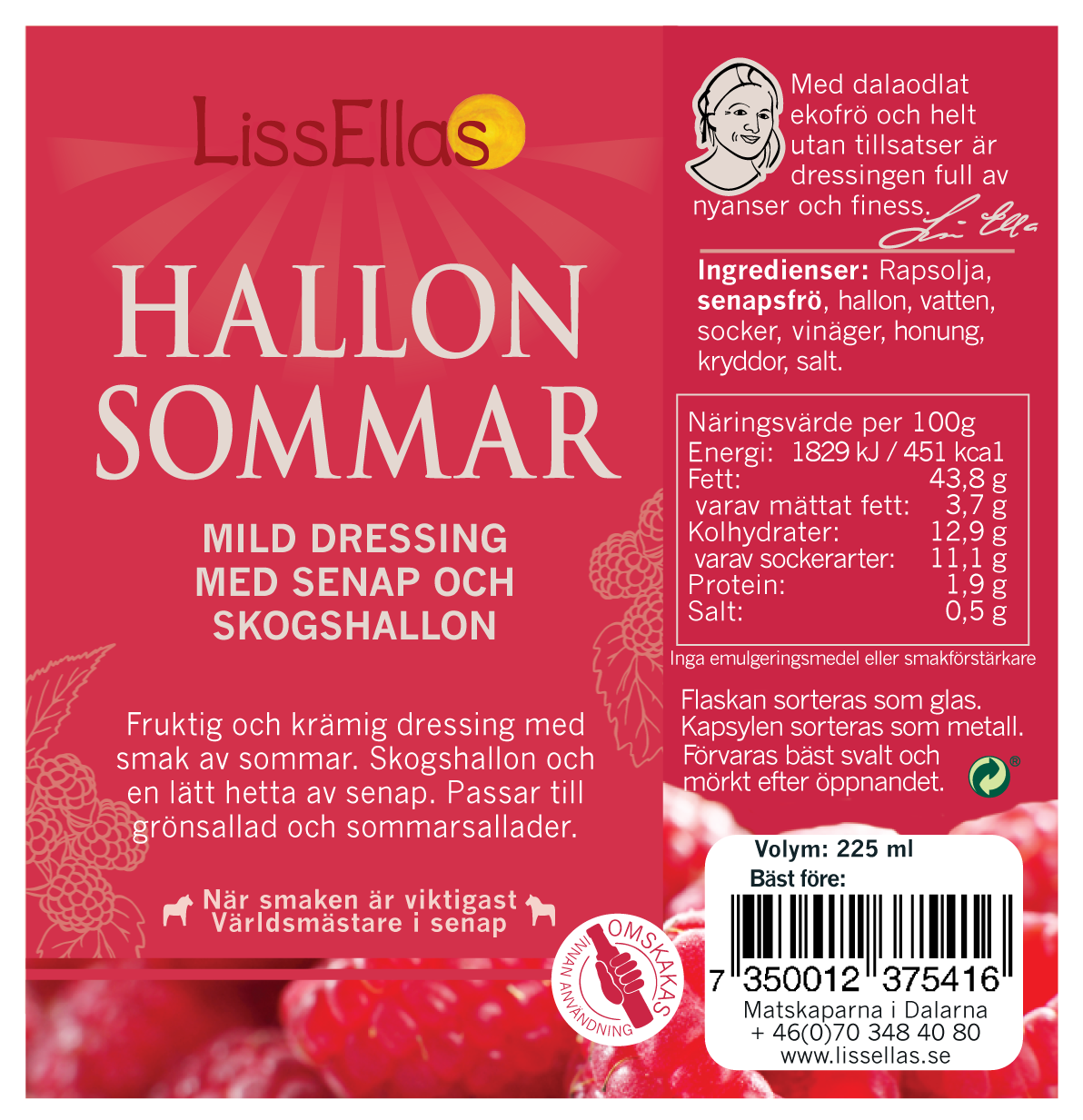 Ingredienser: Rapsolja, senapsfrö, hallon, vatten, socker, vinäger, honung, kryddor, salt.